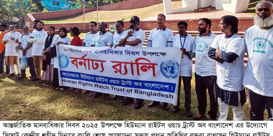 আন্তর্জাতিক মানবাধিকার দিবস ২০২৫ উপলক্ষে হিউম্যান রাইটস ওয়াচ ট্রাস্ট অব বাংলাদেশ–এর উদ্যোগে সিলেটে র্যালি ও আলোচনা সভা অনুষ্ঠিত হয়েছে। মানবাধিকার বিষয়ে জনসচেতনতা বৃদ্ধি এবং ন্যায়বিচার প্রতিষ্ঠায় নাগরিক অংশগ্রহণ নিশ্চিত করার লক্ষ্যে এ কর্মসূচি আয়োজন করা হয়।